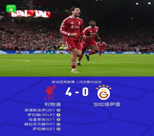 北京时间3月19日欧洲冠军联赛 1/8决赛次回合,利物浦对阵加拉塔萨雷。上半场,索博破门。随后,索博造点,萨拉赫主罚被挡出。下半场,萨拉赫助攻,埃基蒂克建功。萨拉赫射门被扑出,赫拉芬贝赫补射得手。维尔茨做球,萨拉赫兜射轰入世界波。全场比赛结束,利物浦4-0击败加拉塔萨雷,同时也以总比分4-1淘汰对手成功晋级欧冠八强。